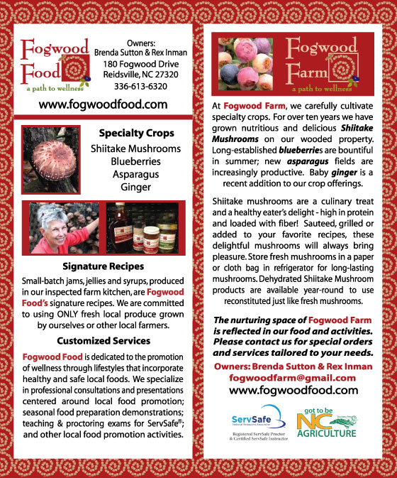 We are small hobby farmers in rural North Carolina. We grow Shiitake mushrooms, asparagus, ginger, blueberries, and other various produce items in small quantities to sell. Fogwood Food is a proud member of Got to Be NC !